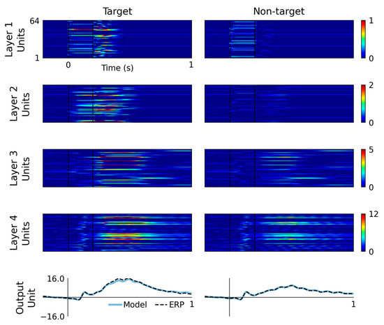 The performance of the final model, trained using the whole dataset, is visualized in Figure 3. The upper four rows display colormap representations of hidden unit activations in response to target and non-target input conditions. The bottom row displays model outputs plotted alongside grand-average ERP waveforms. Viewing this figure from top-down, i.e., from layer 1 to layer 4, it appears that information propagates through the layers, evoking waves of activation across multiple hidden units that spread in complexity, peak latency and amplitude. In some respects, this is analogous to sensory information processing in the ascending central pathways. Magnitude differences between responses to target and non-target events also feature prominently across all model layers. In addition, the outputs shown in the bottom row seem to demonstrate a slightly better fit to non-target waveforms, which might be due to there being a higher number of non-target events (20 [events] × 34 [subjects]) than target events (5 × 34) in the training dataset.