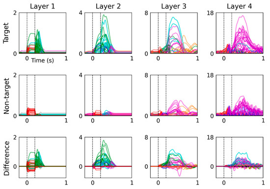 Hidden unit activations are plotted in the time domain in Figure 4, which presents more detailed visualizations of their time-varying dynamics than the colormap images in Figure 3. From the earliest information-processing stages, layer 1 shows notable differences between model responses to target and non-target. This difference partially results from the manner in which input conditions were represented, using a different channel to encode target and non-target events. However, a large portion of the difference between the two input conditions occurs after stimulus offset (at 0.2 s) of the target input condition, which may be more likely to reflect fundamental differences in sequential information processing between the two conditions. This distinct response to target inputs advances through the network layers, leading to a series of large-amplitude hidden unit activations within the 0.4 to 0.6 s window that contribute towards the P3 feature reproduced by the model.