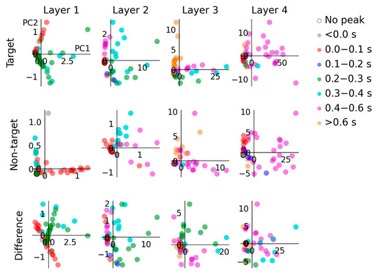 Principal component analysis (PCA) is used to compare model responses to target and non-target input conditions and their difference. Time-domain hidden unit activations from each layer, matrices of size (64 [units], 121 [samples]), are transformed into principal component spaces of size (64 [units], 2 [components]). This transformation preserves as much variance as possible from data in the original matrix while compressing them into fewer columns. Representing 121 time samples with only 2 principal components allows this data to be visualized on a cartesian plane. The results from PCA are plotted in Figure 5, with data points colored according to hidden unit classifications by peak latency described above.