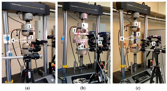 The experimental setup was based on the servo-hydraulic fatigue testing system Instron 8801, which was necessary to imitate cyclic loading caused by the train movement. The loading scheme was designed in order to imitate the loads that studied parts experience during operation, i.e., the rails were subjected to compressive load, the samples from the wheelset to three-point bending, and the samples from the traction clamp to tensile loading. We fixed the rail samples using grips (Figure 2a). Wheelset samples were placed on a three-point static bending fixture (Figure 2b), including two lower supports separated by 250 mm distance, and an upper cylindrical punch with a diameter of 10 mm. Samples from the traction clamp were installed with grips through damping pads (Figure 2c).