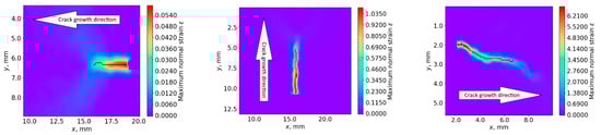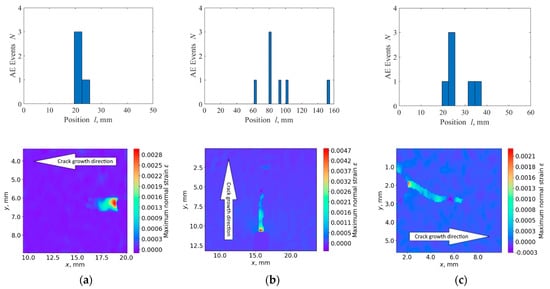 we assume the crack to be detected. The lower row of Figure 4 shows typical strain maps ε(x,y) calculated at the moment TDIC for all three inspected samples. In these distributions, maximum normal strain ε is equal to the threshold value εTDIC. We may see that this criteria is quite reliable in terms of crack detection, but the DIC system needs accurate positioning, and, thus, has to be navigated to the area of the crack by preliminary AE measurements. This is the basis of the proposed two-stage approach to the detection and quantitative evaluation of fatigue cracks.