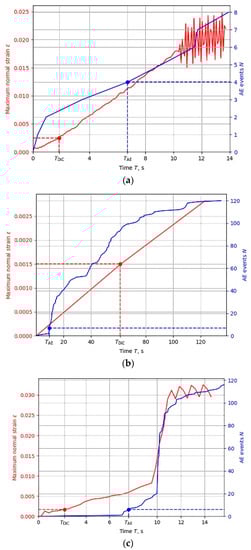 To validate this approach, we applied the described experimental and data processing techniques to all nine samples. Each experiment included continuous acquisition of AE and DIC data, evaluation of AE events number N and maximum normal strain ε, verification of criteria (1) and (3) fulfillment, and measurements of crack location and dimension. Figure 5 shows the typical temporal dependences of N and ε for all three types of inspected samples. Time interval of data acquisition covers the moments TAE and TDIC of fatigue crack appearance according to (1) and (3), as well as its further growth.