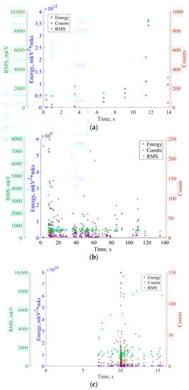 Temporal dependencies of AE events have different shapes that depend on the samples and materials, and correspond to the accumulation of damage processes in the samples. At the moment T < TAE preceding crack detection by AE testing, not all samples demonstrate a sharp increase in AE events, which corresponds to the appearance of AE source by the destruction process [34]. For a detailed analysis, more AE parameters (energy, counts, and RMS) of recorded events were considered (Figure 6).