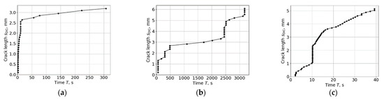 To illustrate the metrological capabilities of DIC, we measured the crack’s dimension sDIC as a length of skeletonized line obtained after processing the field of maximum normal strain ε(x,y) (see upper row of Figure 7) and plotted its temporal sDIC(T) dependence from the moment TAE (see lower row of Figure 7). Inaccuracy dsDIC of this measurement, as well as the inaccuracy of crack’s position estimation by DIC, may be estimated as