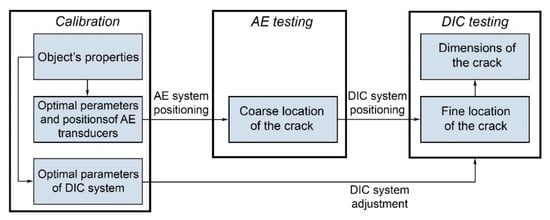 In this study, we propose to implement DIC after primary information on the presence and location of defects is collected by AE testing, either in lab or out-of-lab environment. Further characterization and quantification of defects must be carried out by DIC under conditions close to operation. The proposed approach is thus a compromise between possible qualitative determination of defects in the field conditions and high-precision defect measurement under laboratory conditions.