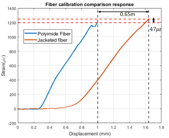 Before embedding the fiber into the textile, different fiber sizes were investigated to explore how the size affects the sensor sensitivity. Fiber optic cables come in different sizes and with different layers of protection. Therefore, the overall size of the fiber should not affect the properties of the composite panel. Furthermore, the fiber should withstand at least 150 °C during the autoclave process and high strain values during the testing phases. Therefore, two single-mode fibers were chosen. Both fibers with the same core size (9 μm). However, the coating material and coating diameter were different. One fiber had an acrylate and jacketed coating with a 650-μm diameter, and the second fiber had a polyimide coating with a 145-μm diameter. Polyimide coating allows the fiber to survive up to 350 °C whereas the acrylate and jacketed last between 130 °C and 200 °C depending on temperature–time exposure. This study was done for two reasons: (1) to reduce the overall cost of fiber fabrication (jacketed fibers are less expensive than polyimide) and (2) to determine how economic fibers will affect the sensitivity of strain measurements.