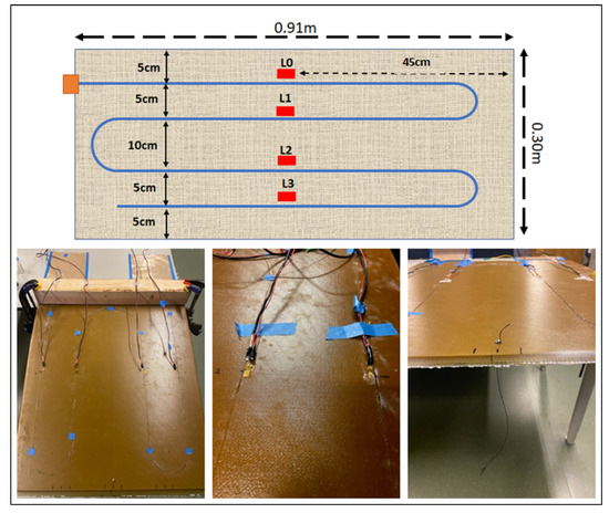 A linear response was observed for both samples Figure 1. The polyimide and jacketed fiber strain coefficients were 1746 mm and 1308 mm, respectively. These results demonstrated that polyimide fiber has a better response to strain changes. The added jacketed coating reduces the strain transfer to the fiber’s core. Additionally, polyimide fiber started detecting strain changes at a 0.2-mm displacement while the jacketed was at 0.4 mm. This further confirms that polyimide has a better strain response; hence, it is better suited for the application explored in this research. In addition, the polyimide fiber had a size comparable to the fiber present in the composite sample. Therefore, it did not affect the structure of the composite. However, for displacement greater than 0.8 mm, it seems the linearity response no longer holds. This response was observed on each of the six cycles. Further studies are needed to understand the interaction between the fabric and the fiber for large tension displacement. The final sensor pattern was fabricated by using the polyimide fiber textile combination. The pattern design used for the smart textile is shown in Figure 2. The fabric was 0.91 m long and 0.30 m wide. The fiber was routed by using a U-shape format with a 5-cm space between each fiber. There were a total of three curvature points and four straight sections.