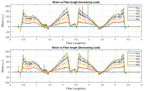 As mentioned, strain measurements were collected by using three sensors (embedded fiber, surface fiber, and strain gauges). The data provided by the fiber sensors corresponds to a distributed measurement, meaning that strain data points were collected at different spatial resolutions throughout the entire length of the fiber. For this research, the resolution was set to 2.6 mm. Figure 3 shows the distributed response for the embedded fiber sensor at different loading conditions. A specific pattern is observed related to the fiber optic sensor orientation. For instance, the data located between lengths 0.2 m and 1.5 m shows a decrease in the strain values. This response originates because the fiber is moving away from the fixed point in the cantilever, whereas the maximum strain response happens. The contrary happens when the fiber returns and moves toward the cantilever-fixed point. As a result, the data between 1.5 m and 2.2 m experienced a strain increase. This pattern is repeated twice because there are three loops in the design (Figure 2).