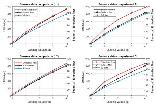 The response of the fiber sensors was also compared with SG, as shown in Figure 4. Specifically, the SG measurements were compared with the surface fiber due to the proximity between both sensors. However, the same approach is used to compare the EF, and the SF can be used to compare the response between the SG and the EF. From Figure 4, we observed a good agreement between the SG and SF at locations L0 and L2. For L1 and L3, a difference is seen between both measurements. This difference occurs because of the bonding between the SG and the composite panel. Extra epoxy was required to create a solid bond between the SG and composite panel since locations L1 and L3 did not adhere to the surface correctly. Because of this, a thicker epoxy layer may have been created between the SG and panel, reducing the strain transfer. Hence, a lower strain value should be measured by the SG.