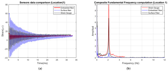 The dynamic test was collected by allowing the composite panel to oscillate freely. By using the same cantilever setup, the panel was compressed 1 cm in the Y-axis and released. As the panel oscillated, measurements were collected from the three sensors installed. Figure 5a shows the damping response for location 1. The embedded and surface sensors measured a minimum strain of 3.1 ] and 5.4 ], respectively. The Fourier transform was computed to determine the fundamental frequency estimated to be 2.11 Hz for the induced vibration (Figure 5b).
