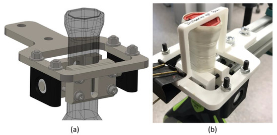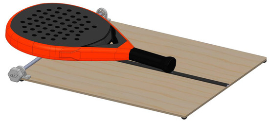 The rackets in the horizontal pendulum are assembled between two 3D-printed parts and pivot around a horizontal axis (Figure 6). The limiter part is fixed with a blinder clip to facilitate the adjustment of the racket paddle in the correct position (with the end of the handle 80 mm from the rotation axis) before holding it with screws. The padel racket cradle and holder have a V-shape identical to the racket handles. The cradle has a shaft that pivots around two ball bearings to enable oscillation. With this design, COM of the padel rackets lies right under the rotation axis. A stopper limits the racket positions that rotate around an axis that passes 8 cm from its bottom. The chosen distance in other studies for tennis rackets ranges from 7 cm [28] through 7.6 cm [27] to 4 inches (10.2 cm) [17]. The present work sets the distance to the mean value of 8 cm. This distance is adequate to represent the area where the player holds the padel racket.