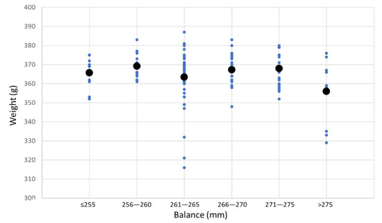 From our study of 137 padel rackets (Figure 3), the minimum and maximum values for the weight of padel rackets are 0.316 kg and 0.387 kg, with a mean of 0.363 kg. The balance of the padel rackets is in the interval of 246 mm to 283 mm, with a mean of 265.52 mm.