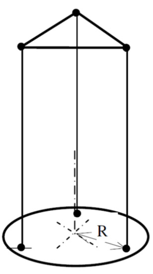 A third method to compute the inertia of an object is the oscillation around the vertical rotation axis. An easy way to enable a free vertical oscillation is to suspend the respective object on one or more threads. A torsional pendulum with three threads or cables is called a trifilar pendulum [30]. The strings are arranged in a triangle with a constant distance R to the axis of rotation (Figure 4).