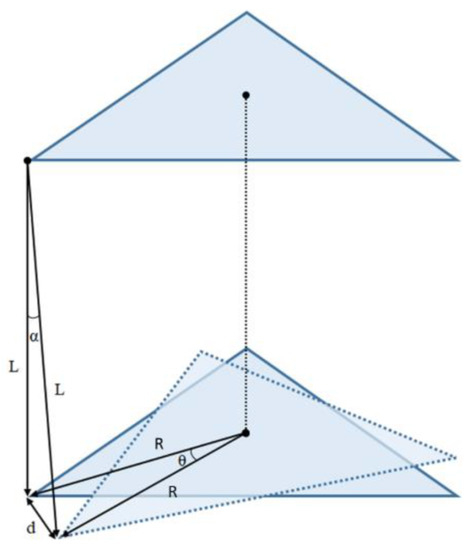 Adding wires to the basic torsional pendulum improves the setup’s stability, and the added threads’ torsional stiffness is insignificant. The pendulum hangs from wires of identical length and rotates vertically around its COM. Friction and mass of the threads are neglected, and the weight force of the rotating body is divided uniformly between them. In addition, small angular displacement for the angles (Figure 5) assumes that tanθ ≈ θ and tanα ≈ α are valid. These assumptions are ordinary simplifications found in different authors [31,32].