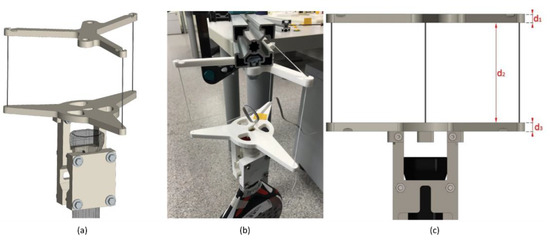 Setup for the vertical rotation. (a) CAD model, (b) final assembly, and (c) detail of strings.