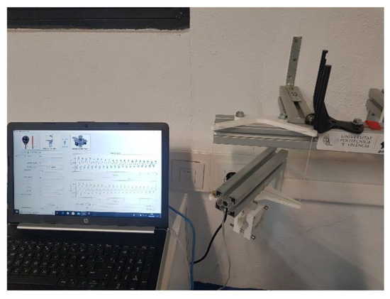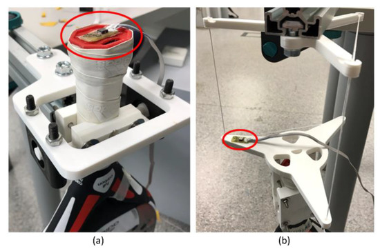 A biaxial accelerometer is used to determine the cycle time of the oscillation. The accelerometer signal’s frequency coincides with the vertical oscillation movement frequency. The signal’s amplitude does not matter, so the position of the sensor is not significant. As shown in Figure 8, the sensor is placed as far away from the rotation axis as possible to obtain a high amplitude and, thus, a less noisy signal. For the case of the vertical pendulum, it is attached to the plate, and the horizontal pendulum is on the racket itself since the holders hardly move.
