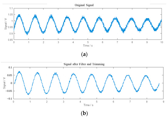 Figure 10. Plots of the signal in the different steps of the processing. (a) Raw signal. (b) Processed signal (filtered and trimmed). - The signal is trimmed (Figure 10b) to consider only a whole multiple of the repetitive period. That means that the dataset starts at the same point of the period where it ends. An offset is applied to the data so that the mean of the values is just zero. After that, complete cycles can be detected by searching for the points where the sign changes from positive to negative or vice versa.