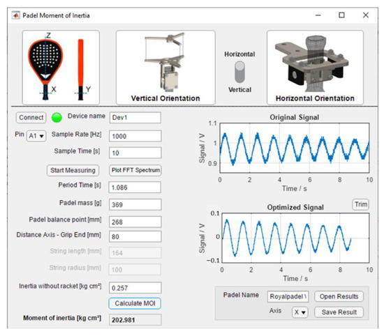 The developed MATLAB® interface facilitates the experiments with the test stand. Apart from the primary function of data acquisition and calculating the MOI from the sensor data and racket parameters, it visualizes the raw (Figure 10a), optimized signal (Figure 10b), and the computed period (Figure 11). Figure 12 shows a screenshot of the interface. Every pendulum needs different parameters (Equations (2) and (3)). This selection enables and disables the corresponding edit fields for the parameters. Before measuring, the I/O device is connected by specifying the device’s name. The measurement starts with an adjustable sample frequency and total sample time. After measuring, the program displays the original sensor signal, the optimized signal, and the resulting period duration from the FFT. The frequency spectrum can be plotted additionally.