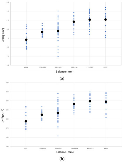 Moments of inertia Ix (a) and Iy (b) and median values as a function of the balance distance.