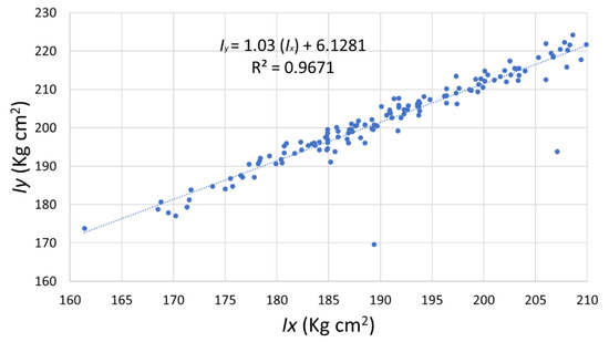 Moreover, from the graph form, the correlation can be expressed by the Pearson correlation coefficient, which measures linear correlation and amounts to 0 for no linear correlation and −1 or 1 for a total linear correlation. The result for the coefficient between dcom and Ix is 0.82, and for dcom and Iy is 0.80. In addition, the two considered moments of inertia correlate strongly with each other. As shown in Figure 15, a padel racket with a high result for Ix also has a high result for dcom (balance) and also a high result for Iy (Figure 16). Here the determination correlation coefficient (R2) amounts to 0.88 and 0.97, removing two outsiders.