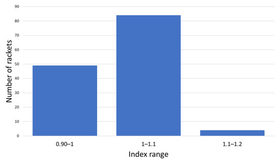Rackets are grouped with each 10% index increment, which means that it takes 10% more effort (10% higher torque) for the player to generate the same acceleration with a racket belonging from one group to the next. With the proposed index, all the rackets in this study can be grouped into three categories. Most rackets belong to the central category, as expected, because manufacturers try to design rackets that can be used for most padel player levels. Higher maneuverability involves less racket weight, which is a good feature for executing control strokes (low-speed strokes). Nevertheless, power strokes are easily executed with higher racket weights (lower maneuverability). Therefore, rackets with medium maneuverability are selected to have both control and power characteristics in the racket.