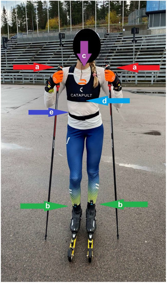 The protocol was performed on a 2.5 km asphalt road loop in Holmenkollen, Norway (Figure 1). The skiers used poles of their individually chosen lengths, equipped with force grips recording at 100 Hz (Proskida, Whitehorse, YT, Canada). All skiers wore their own skating cross-country boots equipped with force insoles recording at 100 Hz (Loadsol, Novel, Munich, Germany). Two pairs of roller skis (Swenor, Sarpsborg, Norway) with type 1 and type 3 wheels (low- and high-friction coefficient) were used during the session. Two IMUs (Physilog 5, Gait Up SA, Lausanne, Switzerland), each composed of a 3D accelerometer and a 3D gyroscope with a sampling frequency of 512 Hz, were mounted using belts on the sternum and on the sacrum, respectively (Figure 2). Another sensor that included a GPS, a 3D accelerometer and a 3D gyroscope, recording at 100 Hz, was also placed on the upper back using a dedicated vest (OptimEye S5, Catapult, Prahran, Australia).