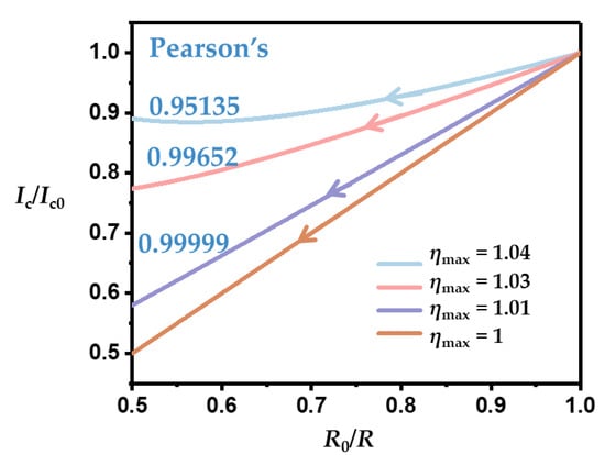 We calculated the relationship between the current change and R0/R to show the influence of RC. Here, RC increased linearly to different maximum values [RC]max ([RC]max = ηmax·R0C0). Pearson’s coefficient is adopted to evaluate the linearity between two datasets. The closer the coefficient is to 1 or −1, the better the linearity. As RC changed more rapidly, the linearity of the current variation decreased (Figure 3). When ηmax = 1.04, meaning that RC increased the most, Pearson’s coefficient was only 0.95135. Furthermore, the increased RC also restrained the current change, resulting in a weaker response when serving as a sensor.