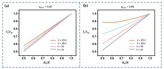 Ic/Ic0 vs. R0/R for different moments at which RC started to change: (a) ηmax = 1.01, (b) ηmax = 1.04.