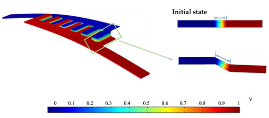 Figure 5 shows the voltage distribution and deformation of the IDTSC under 1 N force. This simulation calculation did not involve the electrochemical physical field, so the electric field distribution does not perfectly match the real situation, especially at the electrode–electrolyte interface. However, it could determine the resistance of the conductor and the corresponding resistance change under deformation, which was sufficient for the resistance analysis in this study. The diagram on the left shows the voltage distribution of the IDTSC under deformation. The voltage changed quickly only inside the gap between electrodes, meaning the electrolyte’s resistance inside the gap contributed most of the total resistance, so its resistance fluctuation may strongly affect the total resistance of the IDTSC. The resistance of the electrolyte could be obtained by dividing the current into the voltage across the positive and negative electrodes, and the capacitance variation could be obtained by substituting the strain data into Equation (6).