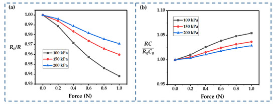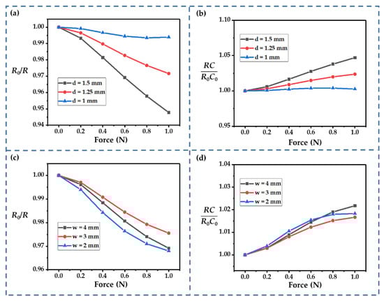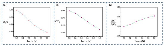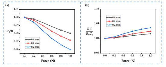 The capacitance and resistance change could be obtained from the simulation results. As shown in Figure 6a,b, the external force caused an increase in the resistance and a decrease in the capacitance. Both of these parameters varied almost linearly with the external force. However, RC reached 1.05 under an external force of 1 N (Figure 6c), which may have exacerbated the nonlinearity according to Equation (8). Hence, parameter optimization was needed to obtain a linear resistance change and more subtle RC change.