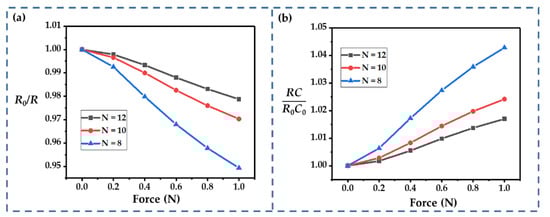The number of fingers (N) is an important structural parameter for an interdigital-type supercapacitor; thus, we first calculated the influence of N, as shown in Figure 7a,b. Obviously, a smaller N increased the changes in R and RC: at the given ranges of N (from 8 to 12), R0/R ranged from 0.947 to 0.979, and RC/R0C0 ranged from 1.043 to 1.017 (at 1 N). This was probably because the subjecting of more fingers to the external force resulted in a lower average strain on each finger. According to Equation (8), increasing N helps to improve the linearity of the current response, because RC changes ony slightly. However, it may significantly increase the size of the device, so a trade-off is required in practical applications.