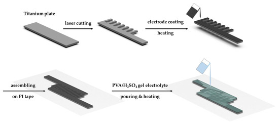 The fabrication process of the IDTSC sensor is as follows (Figure 11): Firstly, a titanium metal plate is cut into a comb shape using high-precision laser cutting. A carbon/CMC/SBR slurry coating is then deposited onto the metal, which is left at 80 °C for 4 h to evaporate the solvent. Then, the prepared electrodes are transferred to the PI tape and assembled into an interdigital configuration. Finally, the H2SO4/PVA solution is poured onto the interdigital electrodes, which are heated at 60 °C until fully cured.