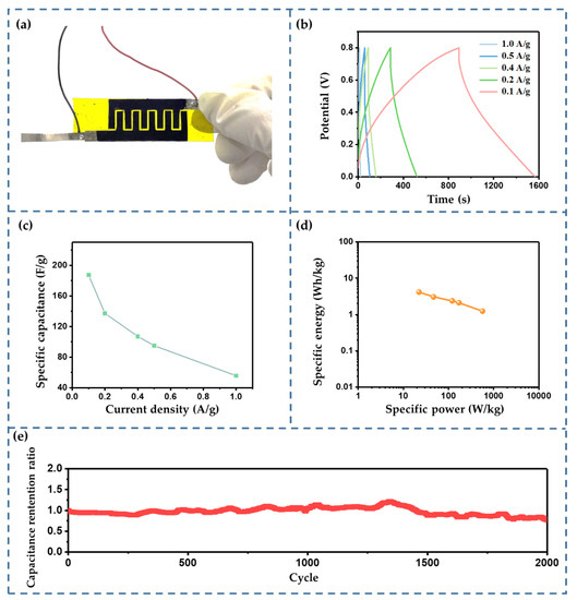 (a) The fabricated IDTSC sensor. (b) GCD curves of IDTSC at different current levels. (c) The specific capacitance vs. the current density. (d) Ragone plot of the IDTSC. (e) Cyclic durability characteristics of IDTSC.