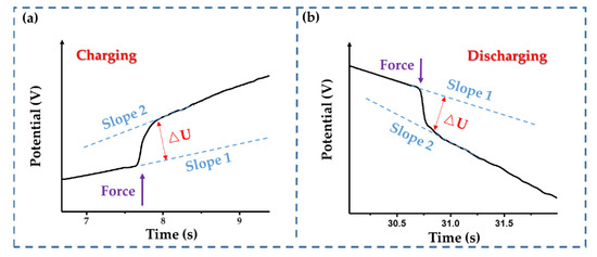 The potential changes while experiencing a step force during (a) the charging process and (b) the discharging process.