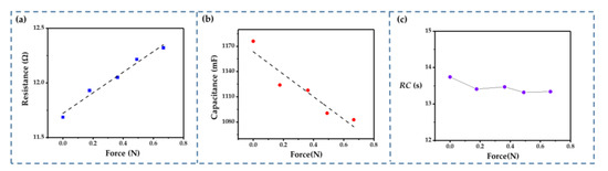 The relationships between the resistance, the capacitance, and the applied force are shown in Figure 14a,b. The corresponding data were calculated from the GCD curve. Both the resistance and capacitance showed a good linear relationship in the given test range. The fabricated IDTSC had a good initial capacitance of 1170 mF and a suitable resistance of 11.7 Ω. The capacitance decreased to 1080 mF, and the internal resistance reached 12.3 Ω as the applied force reached 0.7 N. Furthermore, in agreement with the simulation optimization results, the RC of our IDTSC remained approximately stable as the force increased (Figure 14c).