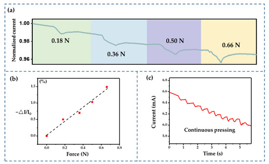 The resistance and capacitance vary under external force, which can result in current variation during constant voltage charging. Hence, the external force may be detected via transient fluctuations in the current. As shown in Figure 15a, the charging current dropped while a transient external force was applied—the greater the external force, the more significant the current drop. The change in the charging current varied linearly with the external force (Figure 15b), exhibiting good sensing properties and meeting our design goal. However, there was a deviation when substituting the actual resistance data into Equation (9). This was probably because the leakage current increased the total current, which is common in supercapacitors. As a result, the incorrectly estimated current increased the denominator in Equation (9), which may have caused an overestimation of the response sensitivity. The fabricated sensor also demonstrated its ability to sense continuous external forces (Figure 15c). The current varied under continuous pressing. The amplitude of these fluctuations was consistent, indicating that the sensing performance was stable.