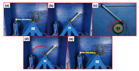 The machete hammer (a) used to generate high-g impact and its working process: (b) Lifting the hammerhead. (c) Pulling on the trigger. (d) Dropping the hammerhead. (e) Hitting the base to generate a high-g impact.