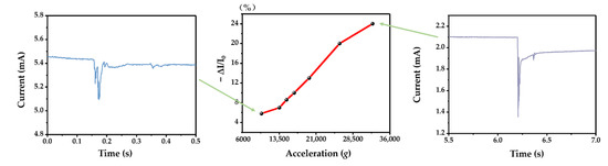 Since the prepared IDTSC was lightweight and the gel electrolyte could provide reliable support, this sensor can be applied in high-g acceleration sensing. A machete hammer was used to generate a high-g impact on the device (Figure 16). As shown in Figure 17, the response increased with the acceleration from 9.9 × 103× g to 3.2 × 104× g. The change ratio is 6% at 9.9 × 103× g and 24% at 3.2 × 104× g. When the acceleration was high, the current showed relaxation, returning slowly after the impact. This suggested that the device may not be suitable for continuous high-g acceleration sensing, especially when the acceleration is high.