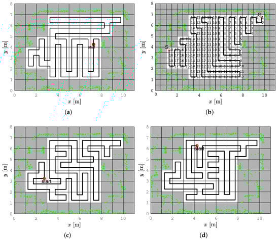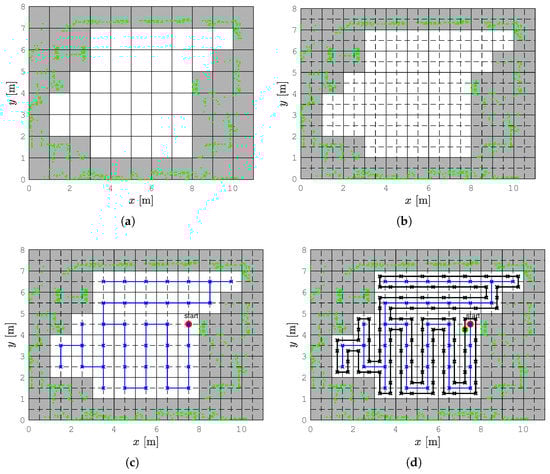 Example of the complete coverage path planning for the known environment step-by-step. The real obstacles collected by SLAM algorithm are presented with green dots. (a) Low resolution occupancy grid map, (b) Subdividing of grid cells, (c) The spanning tree (blue line), (d) Complete coverage path (black line).