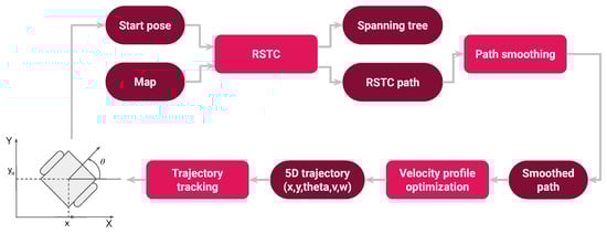 The pipeline of the SCCPP algorithm, shown in Figure 2, consists of four sequentially computed modules. The first module is the replanning spanning tree coverage algorithm (RSTC), which generates a path composed of straight-line path segments perpendicular to each other (Section 3.1). The algorithm initially requires the map of the environment and the starting pose of the robot. The initial map can be a CAD map or a map created with a simultaneous localization and mapping algorithm (SLAM). The second module is the path smoothing algorithm, which smooths the path generated by the RSTC algorithm using clothoids (Section 3.2). The third module is the velocity profile optimization algorithm, which computes the highest admissible velocity profile along the smoothed path accounting for kinematic and dynamic constraints of the robot (Section 3.3). The fourth module is the trajectory tracking algorithm, which ensures that the robot tracks the optimal 5D trajectory generated by the third module (Section 3.3).
