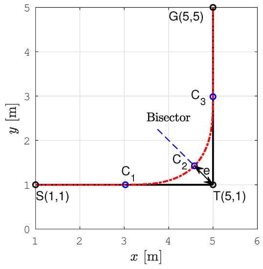 An example of the smoothed sharp turn is shown in Figure 4, where the points S, T, and G denote the start, sharp turn, and the goal position, respectively. The smooth path is shown as a red curve consisting of four parts: a straight line , the first clothoid from to , the second clothoid from to , and a straight line . The two clothoids are symmetric–the second one is obtained by mirroring the first one at the bisector of the angle spanned by the lines and .