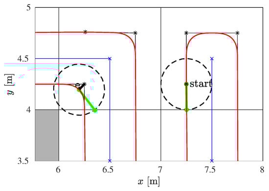 where is the subcell diagonal, and D is the diameter of the circumscribed circle around the robot’s footprint. In our setup it is m, so we choose m. From it is possible to determine the maximum curvature in point (see []), so we obtain .