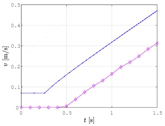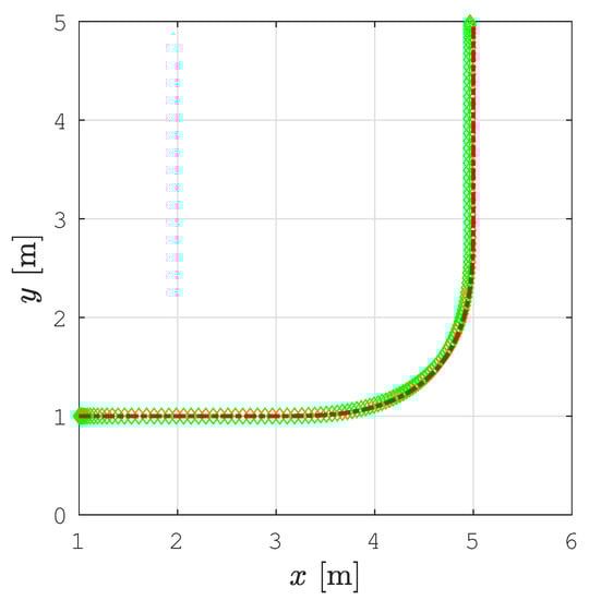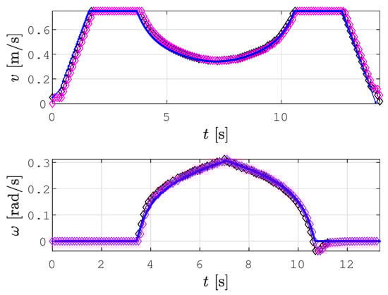 Figure 7 shows linear and angular velocities for the example shown in Figure 4 calculated by the velocity profile optimization procedure (blue line) and the real linear and angular velocity profile, while the robot tracked the trajectory (magenta diamonds). The corrected reference velocities calculated by Kanayama’s algorithm are shown with black diamonds. The robot in the simulation reached exactly the corrected reference velocity with a delay of one control time step.