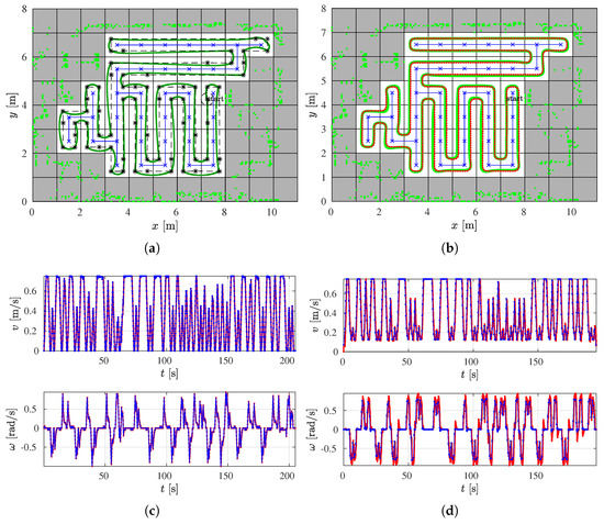 The path is created with straight lines that form sharp turns. In each turn for the CCPP variant, the robot must stop and reorient itself so that the robot heading is equal to the path direction. For this reason, the linear velocity is zero and the angular velocity is close to the maximal value. On straight sections of the path, the linear velocity is maximal and the angular velocity is zero. Figure 8c shows the calculated linear and angular velocities (blue line) and the real linear and angular velocities of the robot executed by the motors (red line).