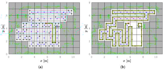 The RSTC algorithm in the Lab scenario with the presented RSTC spanning tree (blue line), the RSTC path (black line), the smoothed path by the SCCPP algorithm (red line), and the executed path by the smoothed RSTC algorithm (green line). Red points are the robots’ position where the replanning algorithm is executed. (a) The smoothed RSTC path in the Lab scenario before replanning. (b) The smoothed RSTC path in the Lab scenario after replanning.