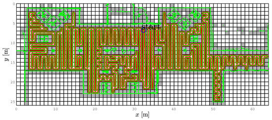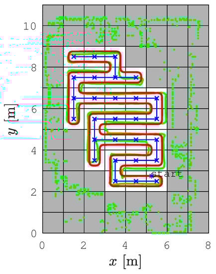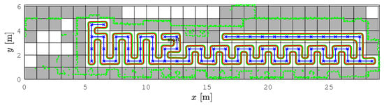 The SCCPP algorithm was executed and the results are shown in Figure 15. The static obstacle configuration is represented as green dots, which are shown as occupied cells (gray cells in Figure 15) in the occupancy grid map. The initial position of the robot ( [m], [m]) is marked with a blue star and this is the starting position for the coverage of the environment. The blue line is the spanning tree determined by RSTC algorithm, the red line is the smoothed RSTC path, and the green line is the driven trajectory by the Pioneer 3DX robot.