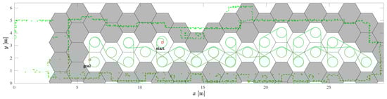 The complete coverage path of the HDCP algorithm is shown in Figure 13 with the green line. Partially occupied cells are shown in gray hexagons and only completely free hexagonal cells are used for the coverage task. The path begins in the cell (11, 3) and ends in the cell (6, 2). Some cells are visited more than once due to the narrow environment and low resolution occupancy grid map.