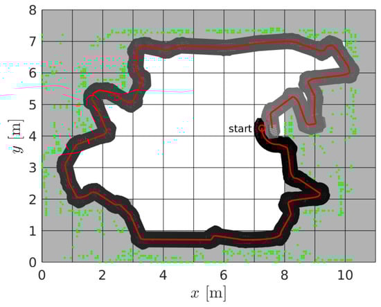 The coverage rate for the SCCPP algorithm can be increased if a wall following method is used, but this also increases the redundancy. The wall following algorithm used after SCCPP is presented in Figure 14 with driven trajectory (red line) and robot’s footprint at every point on the trajectory (degradation from black to gray). The coverage rate is increased to 97.64% with the use of the wall following, and the coverage redundancy is increased to 24.64%.