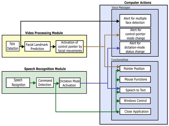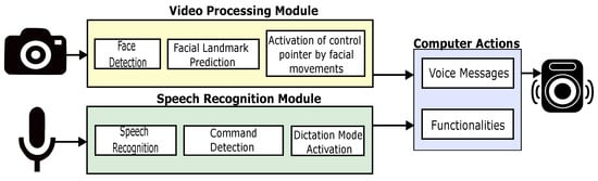 This interface is composed of three modules. Two of them are responsible for acquiring and processing the video and speech signals that will be used to control the application, as shown in Figure 1. The first one is the video processing module, which is dedicated to recognizing facial movements to control pointer positioning. The second module is devoted to voice command recognition and transcription to text. Depending on the recognized command, the interface performs a predefined task related to a mouse action, shortcut key, or application functionality. In addition, this module implements a function that performs the transcription of dictation. The last module plays pre-recorded messages alerting the user of a specific event.