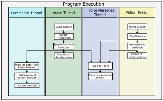 The application was designed to be implemented using multi-threading, where each module has one thread. In addition, the speech-to-text module has an auxiliary thread called “Command Thread” that calculates the cursor’s position. In Figure 2, the execution scheme of the program is presented, specifying the threads that are executed simultaneously and the data transmission between them. The functions performed by each thread are also specified. In the video thread, the user’s image is captured continuously, while the audio thread allows the system to listen continuously to detect commands.